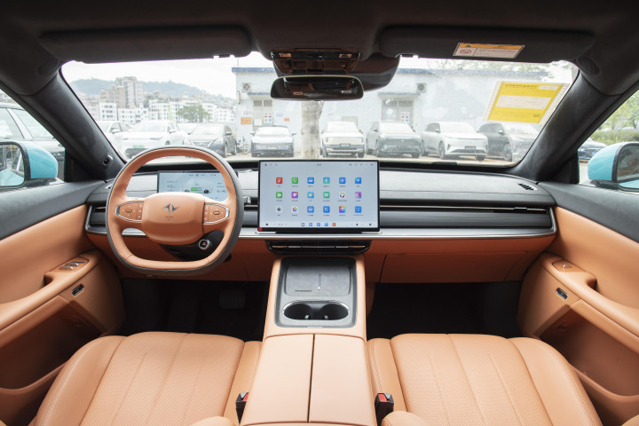 拉开车门坐进车内,简约的内饰风格很对我的胃口 —— 没有堆砌复杂的按键,15.6 英寸的 2.5K 中控屏和 10.25 英寸的仪表屏组成双联屏,悬浮在中控台上,视觉上很清爽。屏幕边框很窄,显示效果细腻,阳光直射时也能看清内容,发小忍不住摸了摸屏幕:“这分辨率比我家的平板还清楚。”