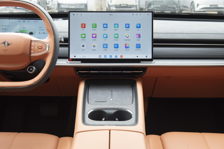 怀挡式换挡机构是个惊喜,解放了中控下方的空间,放了无线充电板和两个杯架。无线充电板的功率是 50W,我的手机放上去,半小时就从 30% 充到了 70%,比家里的无线充电器还快。杯架有可调节的限位器,放矿泉水不会晃,放保温杯也能固定住,细节很贴心。
